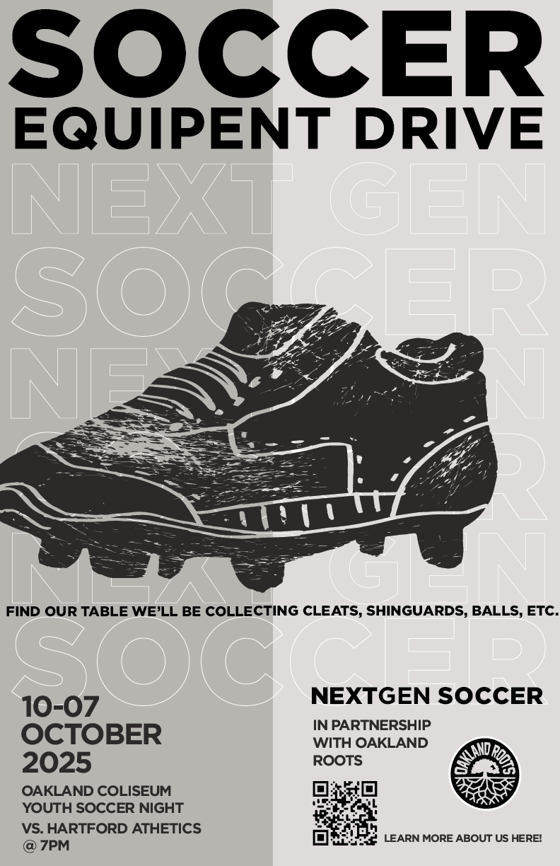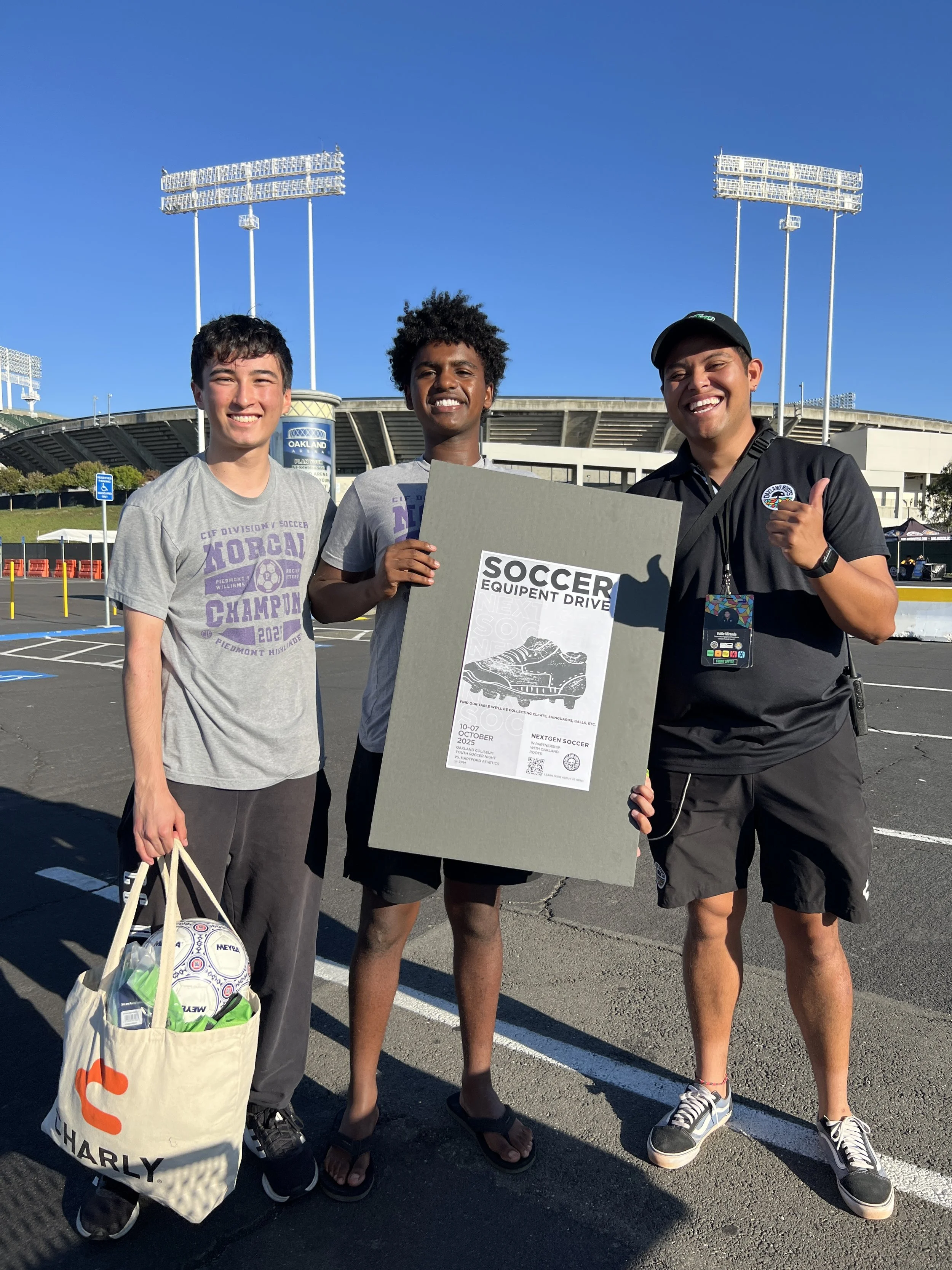 From left to right: Aidan Patty (NextGen Soccer), Nathan Bekele (NextGen Soccer) and Eduardo Miranda (Community Engagement Coordinator at Oakland Roots) and their Oct 7th Equipment Drive at the Oakland Coliseum game.